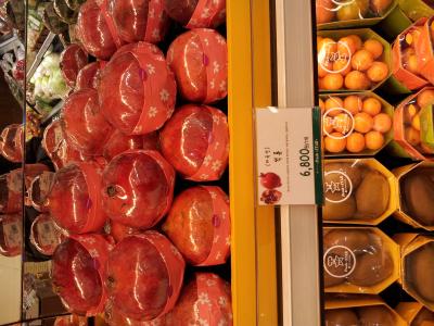 Ud hier ist eingepacktes Obst...in Korea ist eingepacktes Obst ein anerkanntes Geschenk und deshalb kann man in großen und teuren Kaufhäusern für horrendes Geld eingepacktes Obst kaufen, man kann sich auch Obstkörbe zusammenstellen lassen...sehr hübsch und unaufdringlich. De Granatäpfel kosten übrigens fast 5€ , weil sie so schön eingepackt sind.